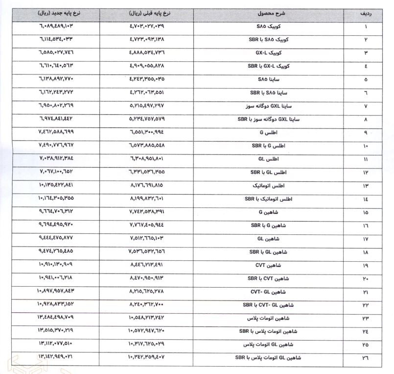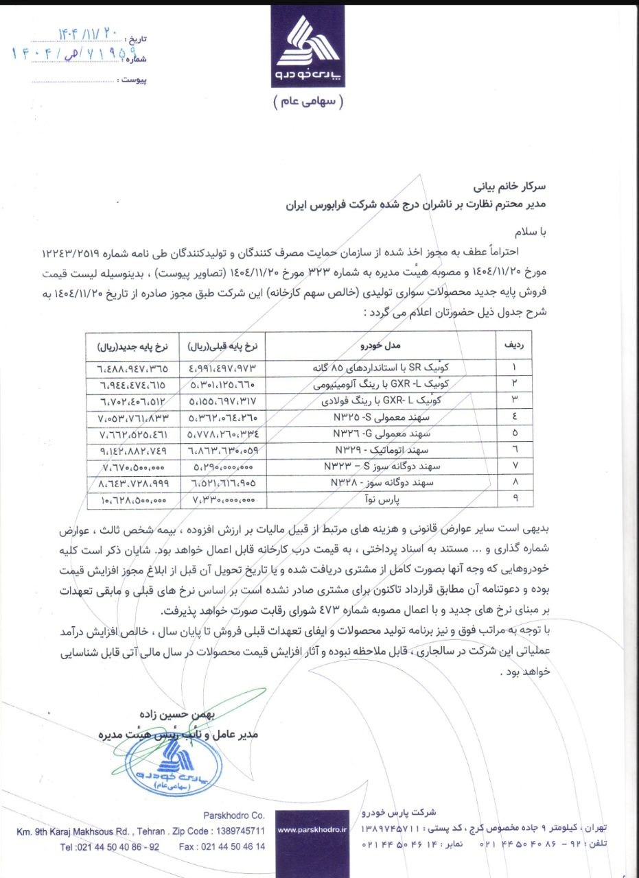 قیمت های بهروزشده پایه تمامی محصولات گروه خودروسازی سایپا و شرکت پارسخودرو منتشرشده در تاریخ ۲۰ بهمن ۱۴۰۴ در سامانه کدال ارائه شده است. اطلاعات درجشده مطابق با ردیفهای اعلامی در مکاتبات رسمی بوده و بدون حذف هیچ موردی تنظیم شده است. همچنین میزان افزایش ریالی و درصد تغییر قیمت هر محصول بهصورت جداگانه محاسبه و درج گردیده است.